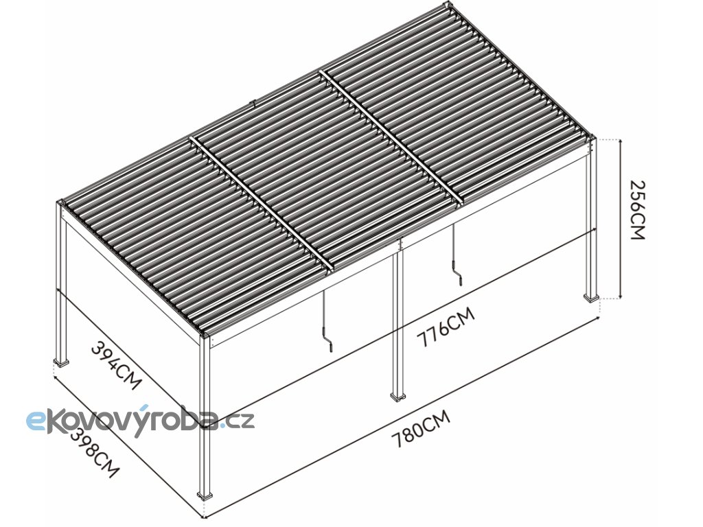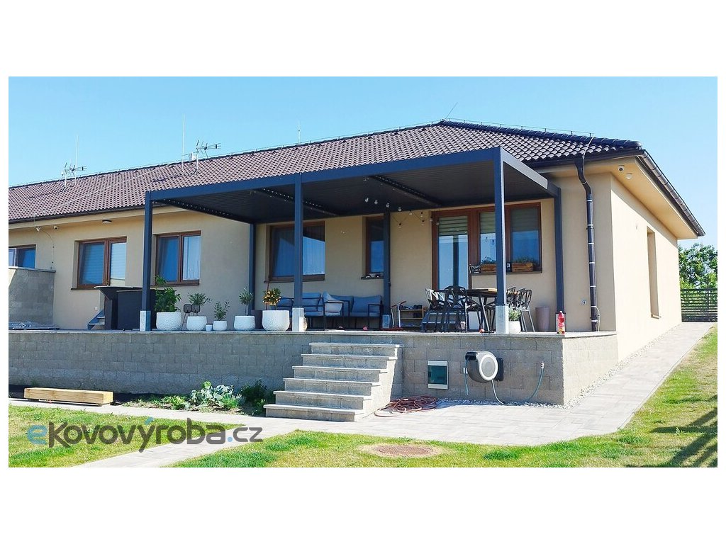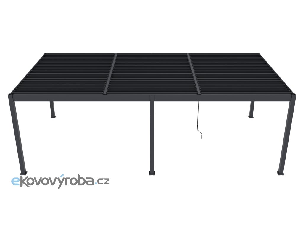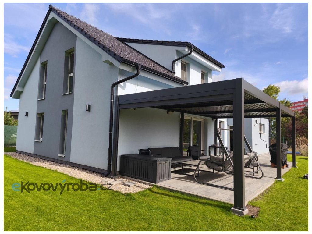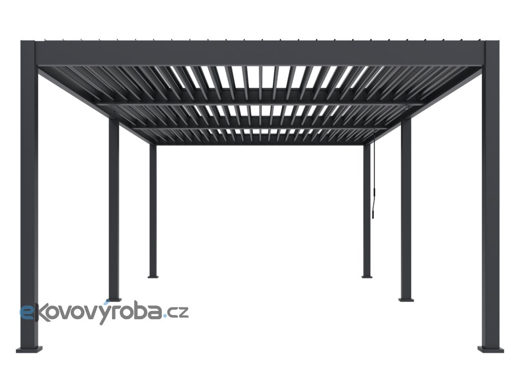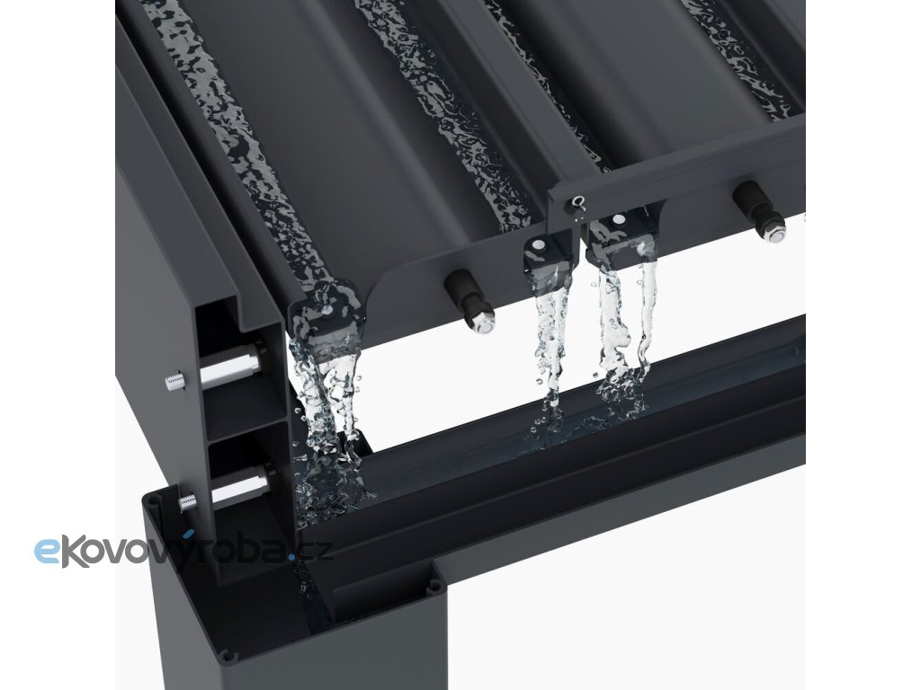 Prémiová zahradní hliníková volně stojící bioklimatická pergola o rozměrech 8x4 metry představuje ideální způsob zastřešení Vašeho venkovního posezení a poskytne Vám opravdu velkou zastřešenou plochu. Velmi pevná a stabilní konstrukce v antracitové barvě RAL 7016, v matné povrchové úpravě se hodí do každého prostoru, není zapotřebí vrtat do stěny. Pergola je vyrobena z vysoce kvalitního hliníku, který je ošetřen práškovou barvou, což zaručuje odolnost vůči povětrnostním vlivům. Lamely jsou rozděleny na 3 zóny a každou tuto část je možné ovládat zvlášť. 75 nastavitelných otočných lamel Vás ochrání nejen před sluncem, ale i před deštěm. Lamely lze otáčet od 0°, kdy docílíte úplně uzavřené střechy až do 135°, díky čemuž získáte skvělou mobilitu a možnost zastínit slunce z jakékoliv strany. Lamely lze ovládat jednoduše manuálně pomocí kličky. Ta je navržena tak, abyste lamely mohli snadno otočit do požadované polohy a aby při otáčení lamel nedocházelo k poškrábání konstrukce pergoly. Zároveň je klička na konstrukci umístěna tak, aby při doplnění pergoly o zástěny či panely nebránila ve snadné manipulaci s těmito doplňky. Kličku můžete jednoduše sundat. Ke svodu vody dochází unikátním drenážním systémem přímo uvnitř konstrukce. Lamely jsou schopné odvést opravdu velké množství vody až 17 l/m2 za hodinu.V zimních měsících je zapotřebí ponechat lamely ve svislé pozici. I přesto jsou lamely schopné unést 30-40 centimetrovou vrstvu sněhu, což představuje zátěž přibližně 50 kg/m2. Toto zatížení však nemůže být dlouhodobé. Kteroukoliv stranu pergoly lze doplnit o zástěnu. V nabídce máme čtyřmetrové zástěny s hliníkovou konstrukcí a výplní z textilenu, které poskytnou ochranu před větrem a zároveň vytvoří příjemný stín. Pergolu je také možné doplnit o stínicí panely s fixními či sklápěcími horizontálními lamelami pro dodatečné soukromí a zastínění. Díky skvělým vlastnostem, detailnímu zpracování a modernímu designu bioklimatické pergoly využijete venkovní posezení mnohem častěji. Robustní sloupek má rozměry 116x116 mm, při instalaci je zapotřebí počítat s patkou sloupku o rozměrech 160x160 mm. Patka je z 8 mm silné oceli a je navíc zakryta hliníkovým krytem (165x165 mm) s integrovaným drenážním systémem. Vyvýšený hliníkový profil s přidanou horní lištou ukrývá lamely tak, že z bočního pohledu nejsou viditelné a jsou v jedné linii s profilem. Mezi jednotlivými zónami s lamelami jsou pevné nosníky, do kterých se nemusíte bát instalovat například osvětlení. S bioklimatickou pergolou si můžete užívat maximum slunečních paprsků, zároveň se můžete proti těmto paprskům i chránit správným nastavením lamel. Pergola též umožňuje snadnou ventilaci prostoru a naopak dokonalý přístřešek v případě deště. HLAVNÍ VÝHODY 75 hliníkových lamel rozdělená střešní část na 3 zóny flexibilnější lamely s úhlem otočení od 0° do 135° vyvýšená horní lišta hliníkového profilu - lamely nejsou vidět ani při otáčení integrovaný drenážní systém celohliníková konstrukce - silné nosníky nejsou viditelné spojovací prvky, šrouby - hladká konstrukce ROZMĚRY PERGOLY