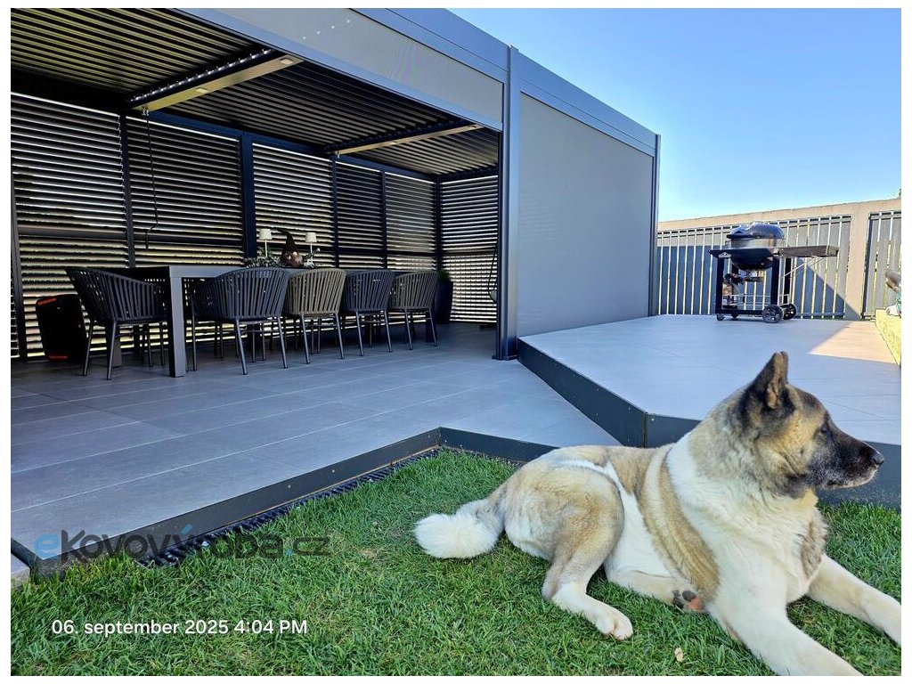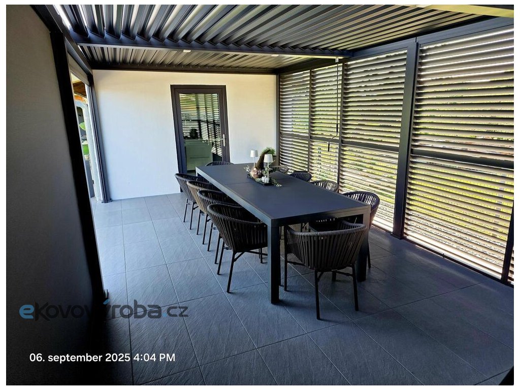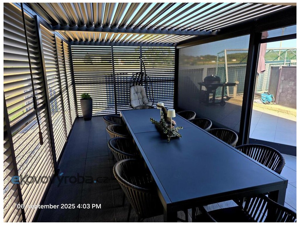 Pro maximální využití bioklimatických pergol nabízíme také příslušenství v podobě panelu s horizontálními sklápěcími lamelami pro zastínění bioklimatické pergoly a získání většího soukromí. Velmi pevná a stabilní konstrukce a lamely v antracitové barvě RAL 7016. Panel a lamely jsou vyrobeny z vysoce kvalitního hliníku, který je ošetřen práškovou barvou, což zaručuje odolnost vůči povětrnostním vlivům. Panel lamel je rozdělen na dvě části, můžete tak sklápět zvlášť horní a spodní část lamel. Lamely je možné mít ve svislé pozici, nebo je natočit maximálně o 120°. Panely je možné na sebe napojovat a vytvořit tak například jednu stranu plně zastíněnou horizontálními lamelami pro dodatečné soukromí. Při použití 3 panelů plně zastíníte stranu o rozměru 4 m. Panely lze samozřejmě použít na částečné zastínění nebo jako designový prvek. Panely jsou kompatibilní se všemi typy našich bioklimatických pergol. Je možné je instalovat jak na přední, tak i boční strany pergoly. Využití naleznou panely i u pergol s instalací do stěny, kde je možné panel přivrtat do zdi a vytvořit si tak za pomoci panelů částečně či plně zastíněnou stranu. TÜV CERTIFIKACE - Pergola byla testována a byla jí udělena certifikace TÜV, která je známkou kvality, bezpečnosti a spolehlivosti. Bezpečnost – TÜV se zaměřuje na testování výrobků s ohledem na jejich bezpečnost pro uživatele. Kvalita – Produkty a výrobní procesy musí splňovat specifické normy kvality, což zaručuje jejich vysokou úroveň. Ochrana životního prostředí – TÜV certifikace zahrnuje také kontrolu vlivu na životní prostředí včetně ekologické udržitelnosti výrobků. Shoda s normami – Produkt musí splňovat specifické národní i mezinárodní standardy a legislativu. Spolehlivost – Certifikace je známkou toho, že produkt nebo služba je spolehlivá a bezpečná pro dlouhodobé užívání. Díky skvělým vlastnostem, detailnímu zpracování doplňků a modernímu designu bioklimatické pergoly využijete venkovní posezení mnohem častěji. HLAVNÍ VÝHODY možnost sklápění lamel - funkce ventilace i vytvoření stínu zastínění pro dodatečné soukromí kvalitní, bezúdržbový hliník možnost napojování panelů TÜV certifikace