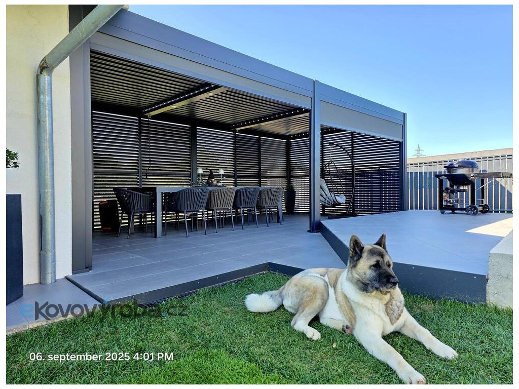Pro maximální využití bioklimatických pergol nabízíme také příslušenství v podobě panelu s horizontálními sklápěcími lamelami pro zastínění bioklimatické pergoly a získání většího soukromí. Velmi pevná a stabilní konstrukce a lamely v antracitové barvě RAL 7016. Panel a lamely jsou vyrobeny z vysoce kvalitního hliníku, který je ošetřen práškovou barvou, což zaručuje odolnost vůči povětrnostním vlivům. Panel lamel je rozdělen na dvě části, můžete tak sklápět zvlášť horní a spodní část lamel. Lamely je možné mít ve svislé pozici, nebo je natočit maximálně o 120°. Panely je možné na sebe napojovat a vytvořit tak například jednu stranu plně zastíněnou horizontálními lamelami pro dodatečné soukromí. Při použití 3 panelů plně zastíníte stranu o rozměru 3 m. Panely lze samozřejmě použít na částečné zastínění nebo jako designový prvek. Panely jsou kompatibilní se všemi typy našich bioklimatických pergol. Je možné je instalovat jak na přední, tak i boční strany pergoly. Využití naleznou panely i u pergol s instalací do stěny, kde je možné panel přivrtat do zdi a vytvořit si tak za pomoci panelů částečně či plně zastíněnou stranu. TÜV CERTIFIKACE - Pergola byla testována a byla jí udělena certifikace TÜV, která je známkou kvality, bezpečnosti a spolehlivosti. Bezpečnost – TÜV se zaměřuje na testování výrobků s ohledem na jejich bezpečnost pro uživatele. Kvalita – Produkty a výrobní procesy musí splňovat specifické normy kvality, což zaručuje jejich vysokou úroveň. Ochrana životního prostředí – TÜV certifikace zahrnuje také kontrolu vlivu na životní prostředí včetně ekologické udržitelnosti výrobků. Shoda s normami – Produkt musí splňovat specifické národní i mezinárodní standardy a legislativu. Spolehlivost – Certifikace je známkou toho, že produkt nebo služba je spolehlivá a bezpečná pro dlouhodobé užívání. Díky skvělým vlastnostem, detailnímu zpracování doplňků a modernímu designu bioklimatické pergoly využijete venkovní posezení mnohem častěji. HLAVNÍ VÝHODY možnost sklápění lamel - funkce ventilace i vytvoření stínu zastínění pro dodatečné soukromí kvalitní, bezúdržbový hliník možnost napojování panelů TÜV certifikace