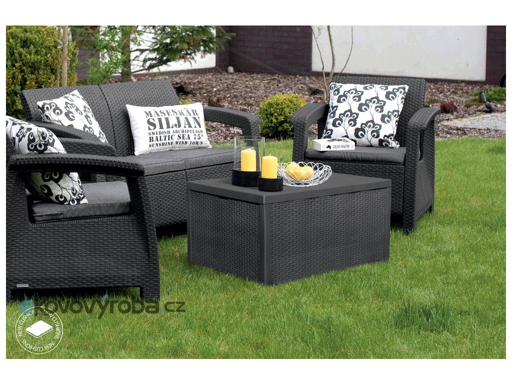 Corfu box je další set v oblíbeném designu Corfu. Jedná se o elegantní nábytek v imitaci přírodního ratanu, skládající se ze dvou křesel, dvojitého sofa a stolu, který zároveň slouží jako box! Produkt je dodáván s měkkými poduškami ve stylových barvách. Lehká a stabilní konstrukce nábytku se skvěle hodí do vnitřních i venkovních prostorů, jako je zahrada nebo terasa. Velmi snadná údržba a sestavení, navíc vysoce odolný materiál proti UV paprskům a povětrnostním vlivům.