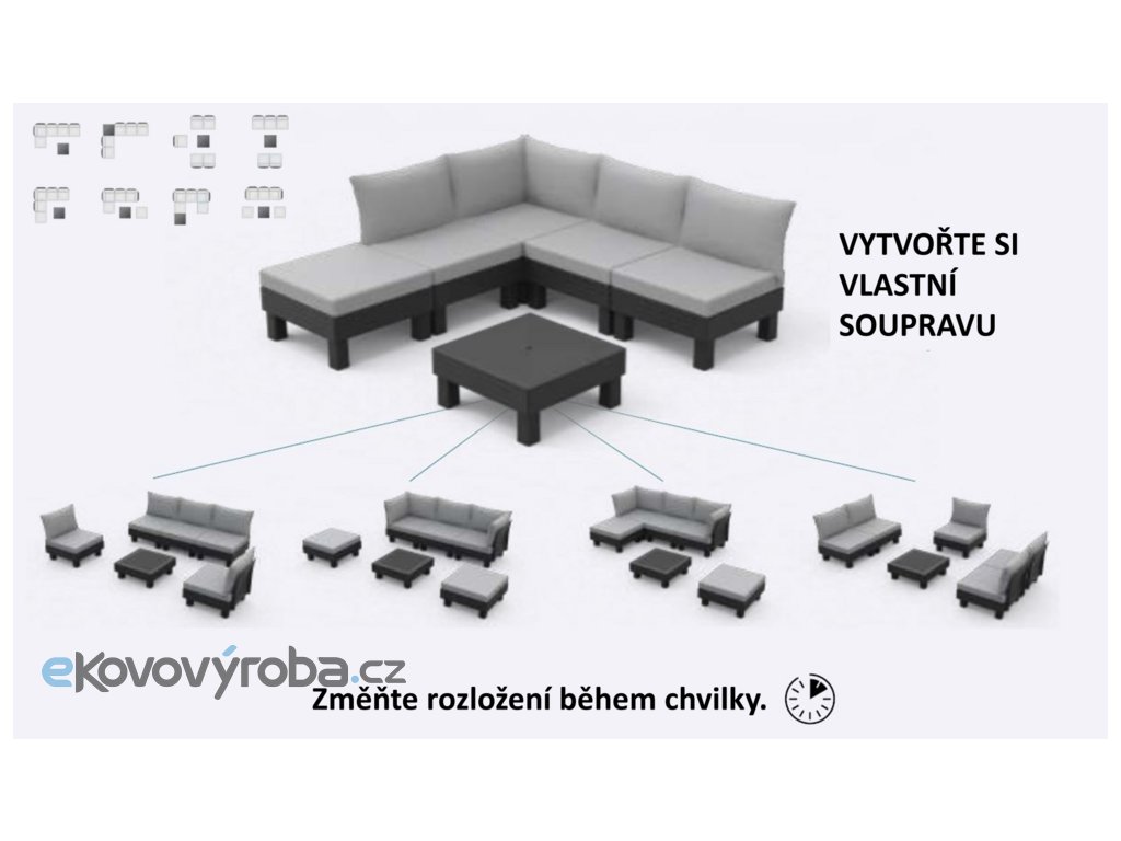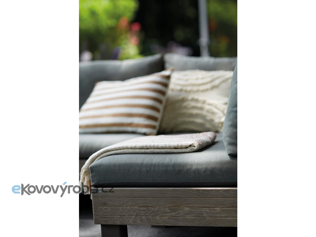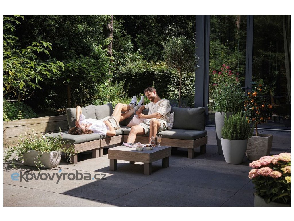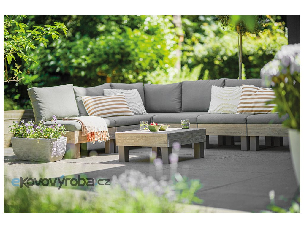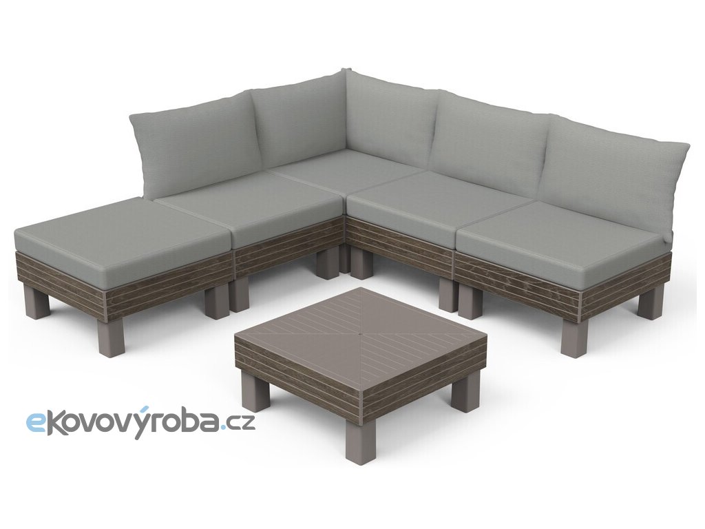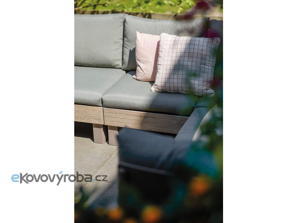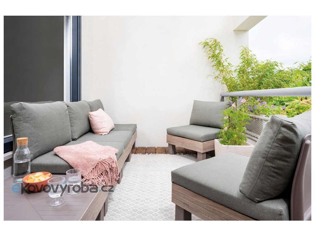 Set ELEMENTS Vám umožní uspořádat si moderní venkovní posezení dle Vašich představ. A když budete občas potřebovat více křesel místo sofa, nebo jiné uspořádání, není to pro set problém. Díky chytrému modulárnímu systému, který nabízí mnoho možných konfirgurací, jednoduše přemístíte a zacvaknete jednotlivé prvky na požadované místo. Pro ještě větší pohodlí jsou součástí soupravy 9 cm vysoké podušky a opěrky. Podušky jsou z příjemného materiálu polybavlna a spodní část je z netkané textílie s protiskluzovým tečkami. Pevný lisovaný plast, z kterého je souprava vyrobena, je odolný vůči nepříznivým povětrnostním podmínkám a UV záření. Výhody soupravy ELEMENTS: jednoduchá montáž snadná údržba kompaktní způsob uskladnění, zabírající miminum místa pevný materiál připomínající dřevo kovové spojky