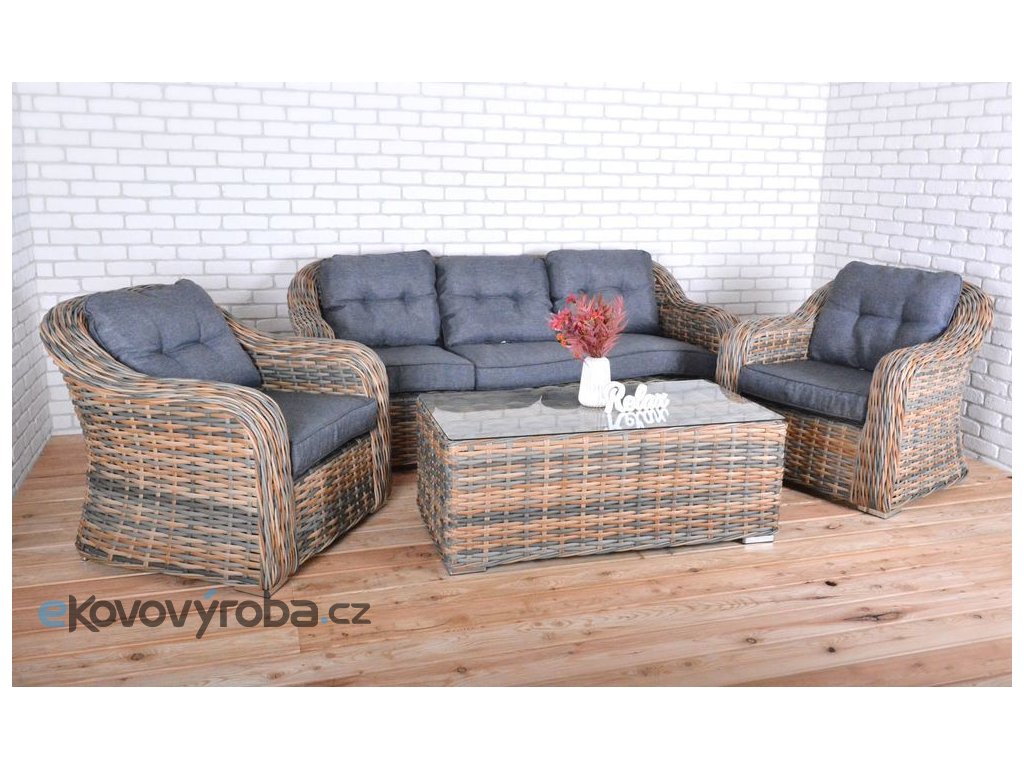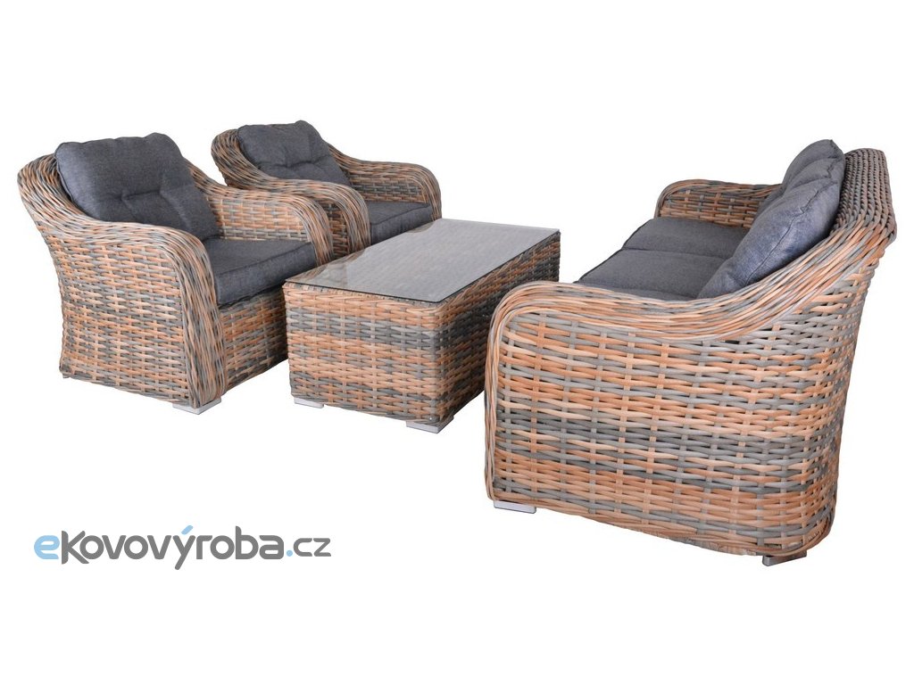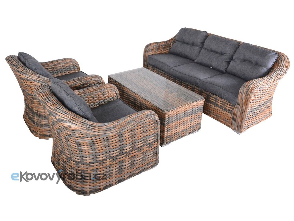 Luxusní sestava nábytku z umělého ratanu a hliníkové kostry. I když se umělý ratan podobá přírodnímu, je mnohem odolnější. Obecně lze říci, že je pružnější a je méně pravděpodobné, že se poničí.Umělý zahradní ratanový nábytek vyniká snadnou údržbou a velkou odolností vůči nepřízni počasí. Umělý ratanový nábytek se neloupe, nevznikají na něm nevzhledné praskliny, je stálobarevný po mnoho let. Jestliže nechcete mít obývací pokoj laděný ve stejném duchu jako ostatní, ratanový nábytek je možným řešením, jak se odlišit i v interiéru.Luxusní polyratanový nábytek má opravdu velmi široké využití. Je vhodný pro vnitřní i venkovní prostory, zahrady, terasy, zimní zahrady, balkony, kanceláře, jednací místnosti, recepce a další nebytové i bytové prostory. Nemusíte nic skládat ani montovat - nábytek je již připraven k okamžitému použití. Podušky jsou odnímatelné. Luxusní souprava z kvalitního umělého ratanu, který odolává UV zářenía teplotě od +50°C do -10°C.Kostra je hliníková + prášková barva.Ratan: 2x2 kulatýDeska stolu: 5mm tvrzené skloPodušky:výplň-10 cm molitan, látka-230g/m2 polyester Podušky na sedací části jsou vybaveny zipem, což umožňuje snadné praní povlaku. Zádové podušky jsou prošité knoflíky a nelze povlak sejmout.