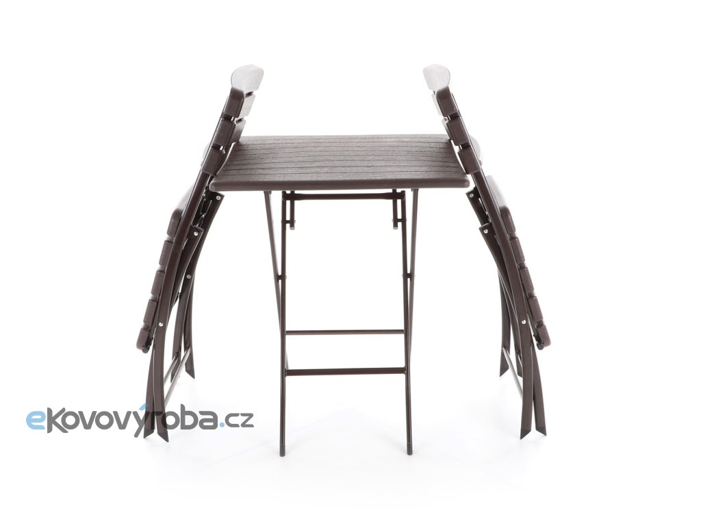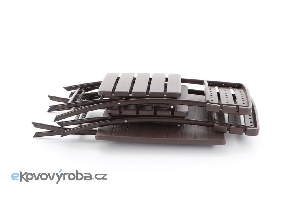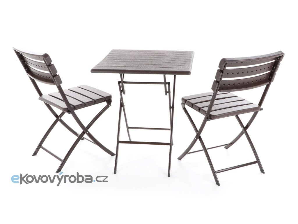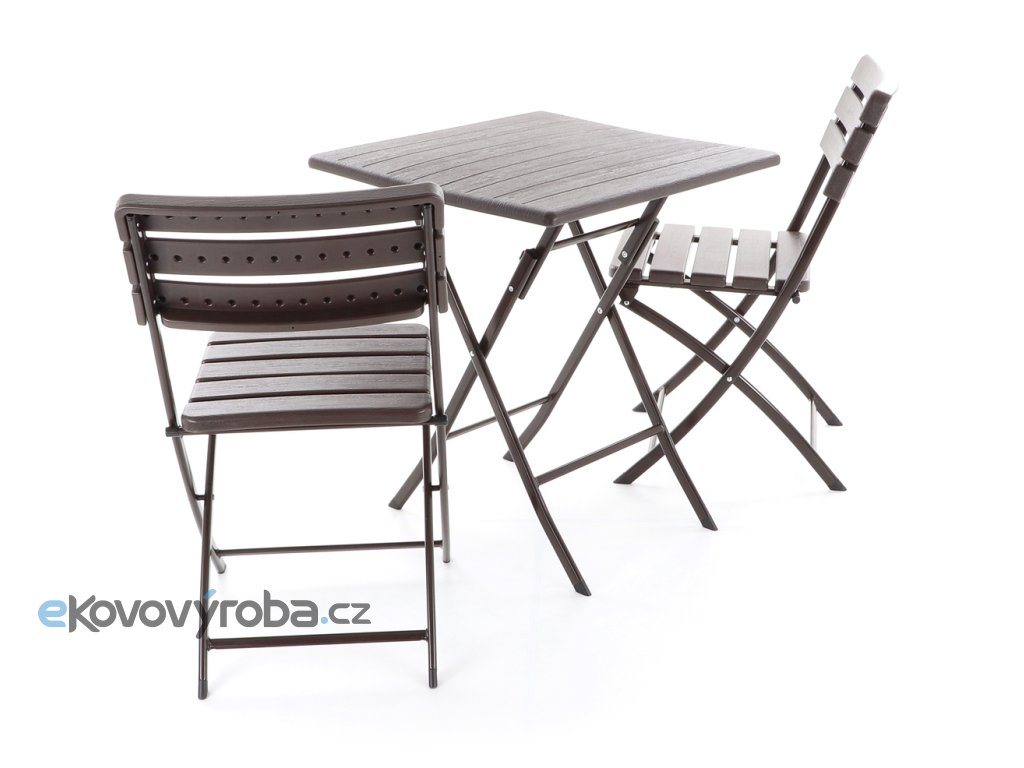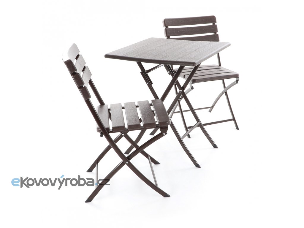 Stolová sestava dvou skládacích židlí z ocelových profilů povrchově dokončena komaxitovou barvou , čalounění je v imitaci masivního dřeva z lisovaného plastu s UV filtrem , určená do interiérů, exteriérů a pergolových prostor.