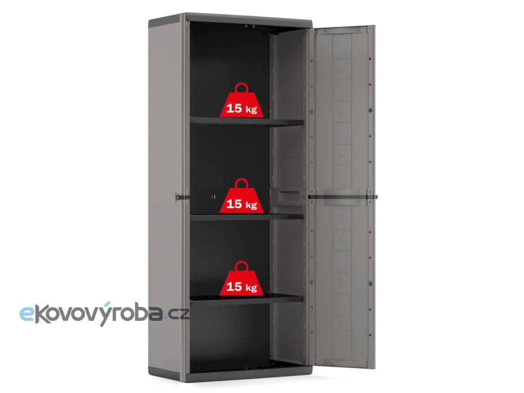 Plastové skříně Jolly italské výroby jsou oblíbené pro svou snadnou montáž, ke které není potřeba nářadí. Další jejich výhodou jsou snadno posunovatelné poličky i přizpůsobení na visací zámek. - snadná montáž bez potřeby nářadí- uzamykatelná na visací zámek (není součástí balení)- poličky snadno posunete nahoru či dolů podle svých potřeb- každá z 3 polic unese 15 kg- dvoudvéřové provedení