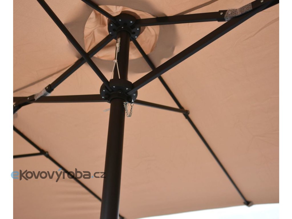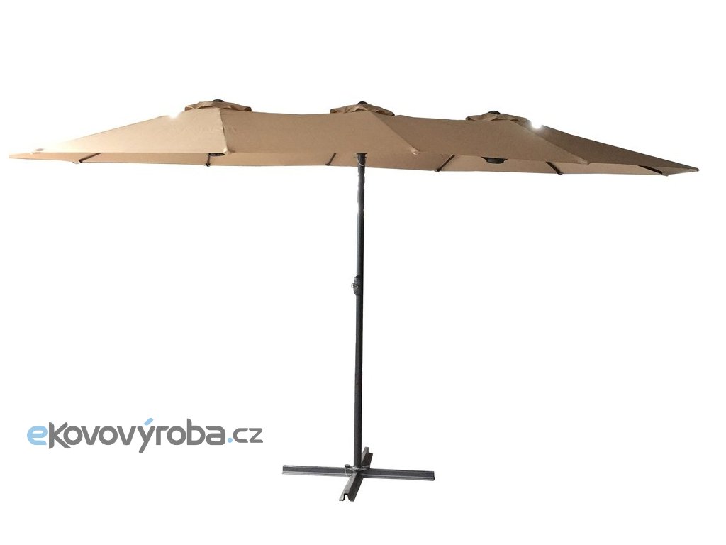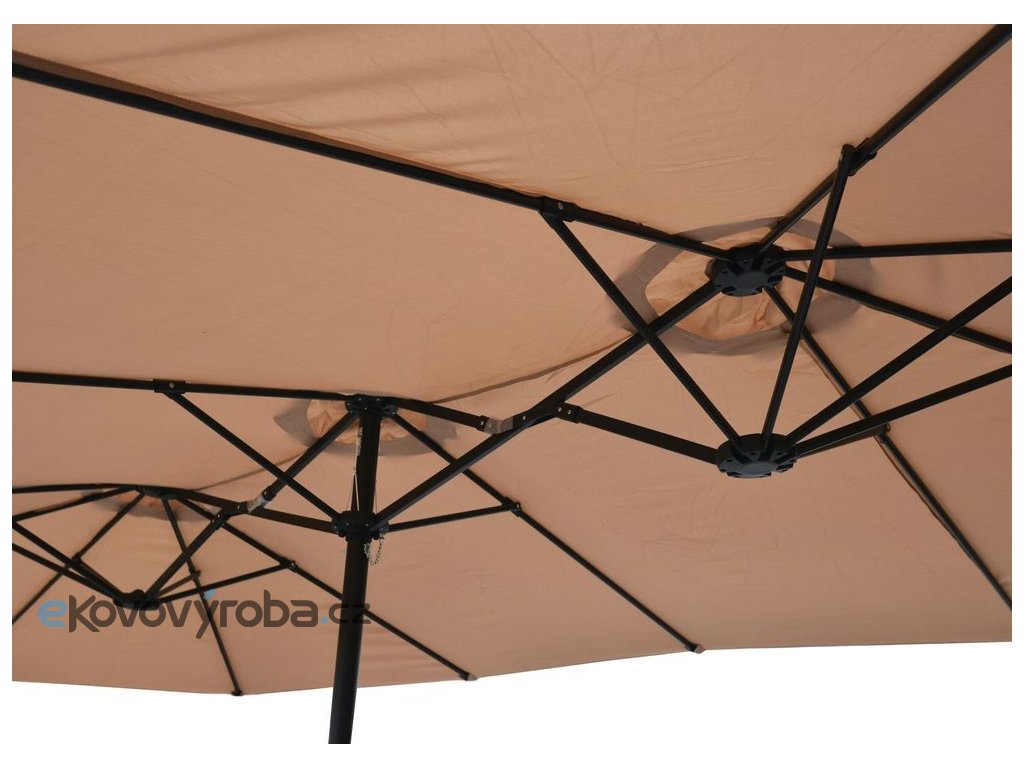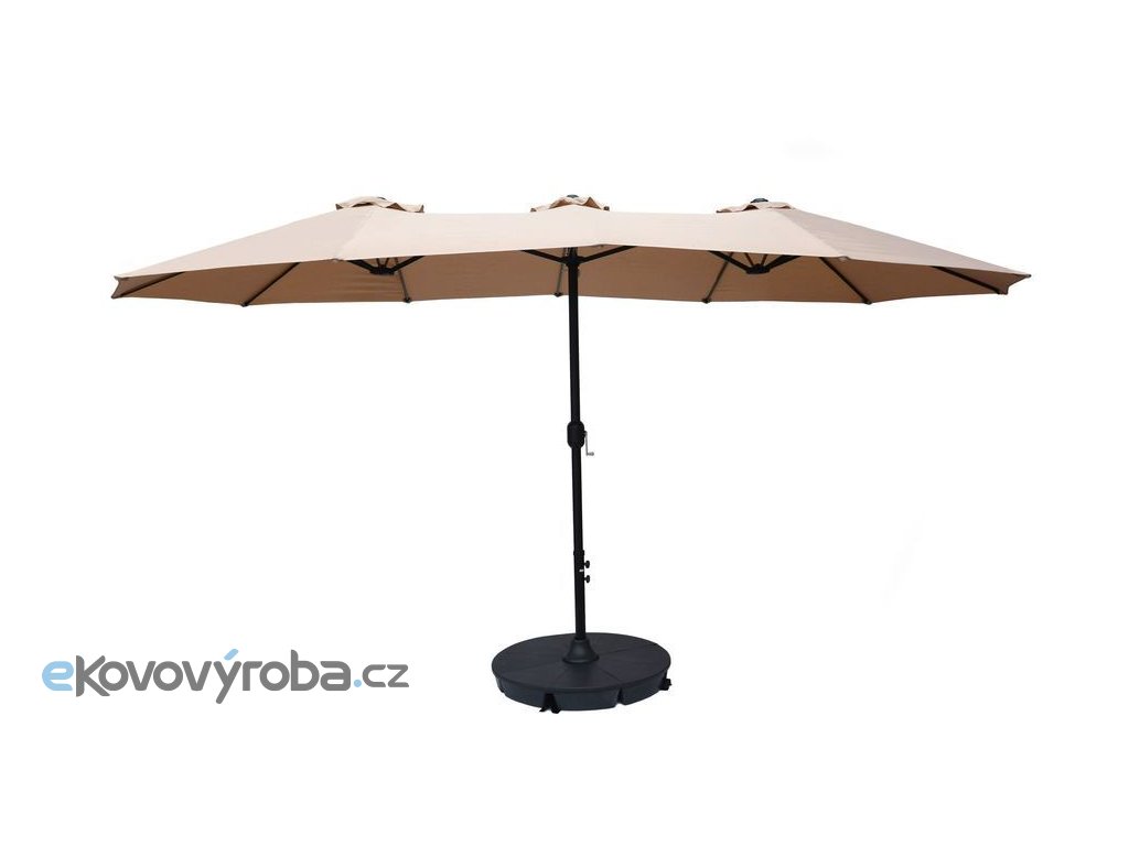 Opravdu velký, středový slunečník se dvěma rameny pro komfortní stínění oválného stolu. K otevírání slouží klička. Slunečník s moderním designem bez střapců. Součástí je i křížový podstavec, který je zapotřebí zatížit dlaždicemi.