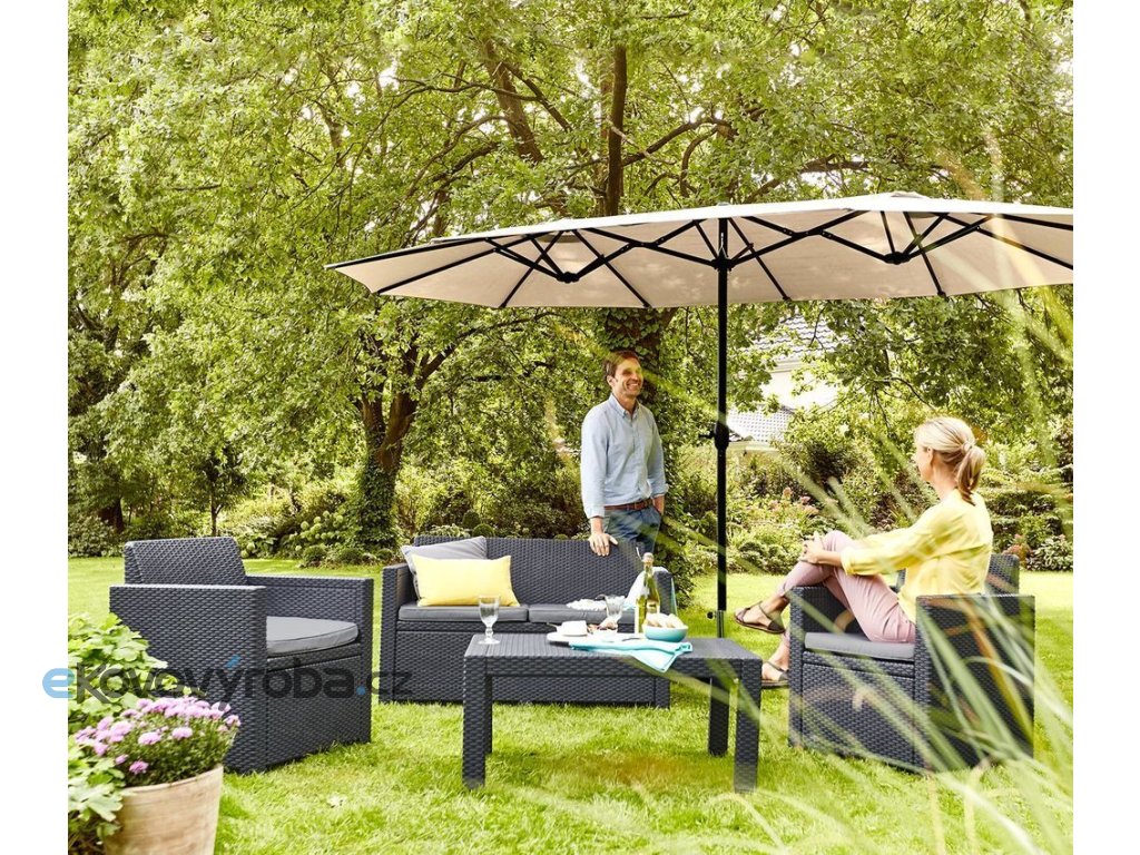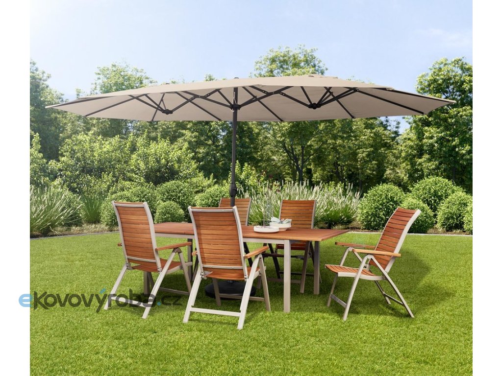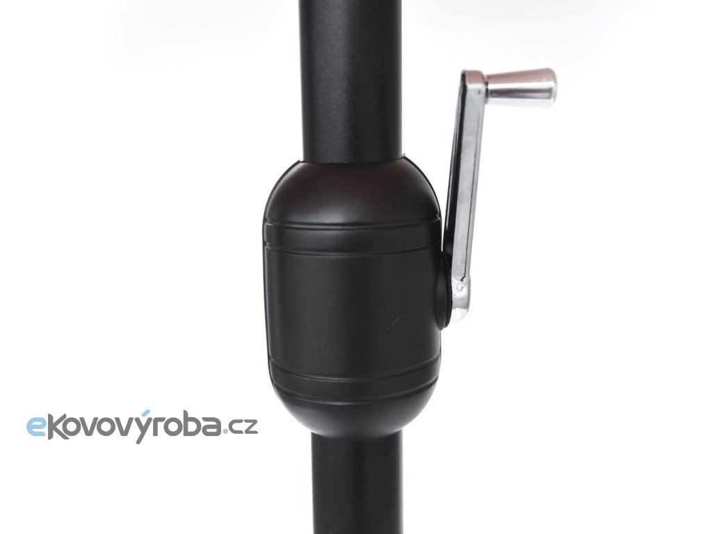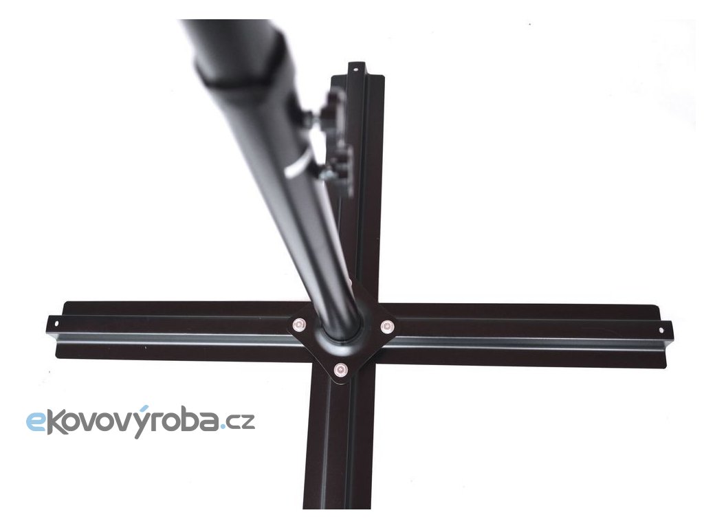 Opravdu velký, středový slunečník se dvěma rameny pro komfortní stínění oválného stolu. K otevírání slouží klička. Slunečník s moderním designem bez střapců. Součástí je i křížový podstavec, který je zapotřebí zatížit dlaždicemi.
