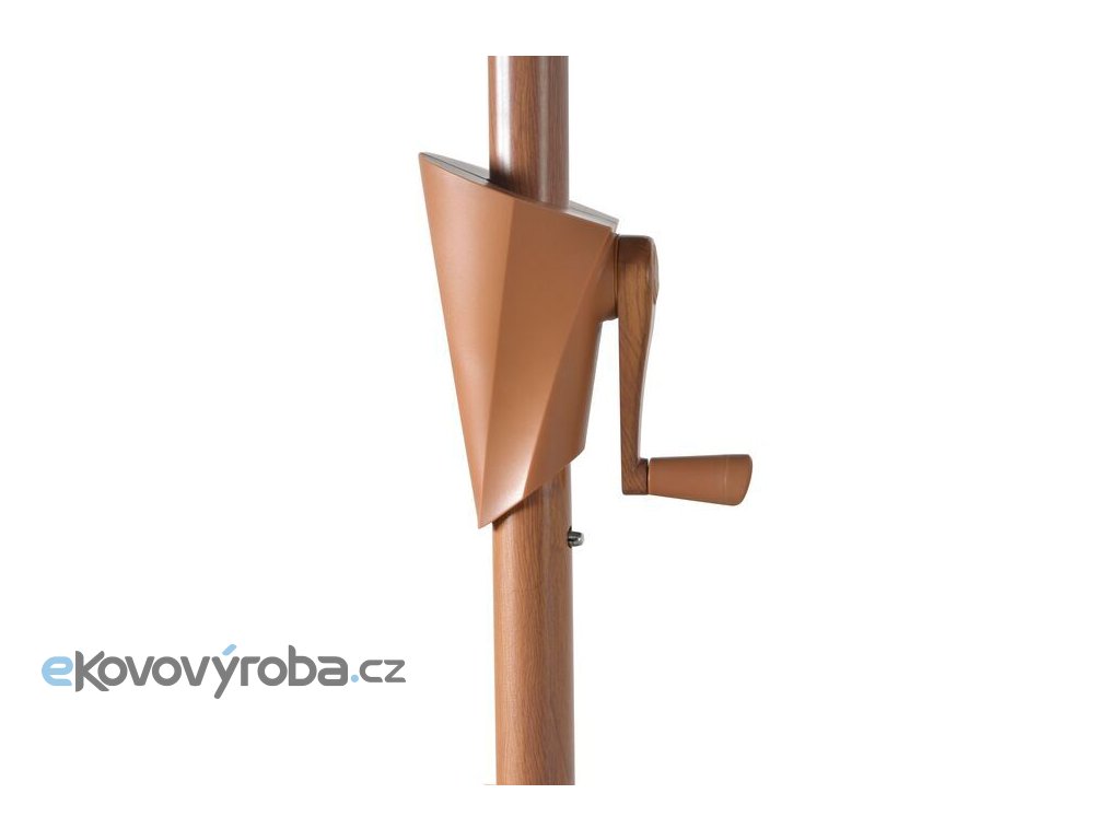 Šestiramenný naklápěcí slunečník s moderním designem a pevnou kovovou konstrukcí. Tyče v dekoru dřeva Otevírání za pomoci designové kličky, potah má vodoodpudivý nástřik, takže Vás ochrání před mírným deštěm. BEZ PODSTAVCE