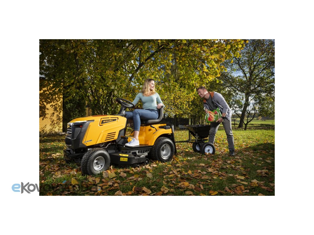 Traktor je vybaven moderními LED světlomety, širokým předním nárazníkem a integrovanou tryskou pro připojení hadice, která umožňuje snadné čištění žacího prostoru. Praktickým detailem je držák na nápoje a sada základního nářadí dodávaná spolu se strojem. Díky tažnému zařízení lze připojit širokou škálu příslušenství – od vozíků a rozmetadel až po válce, provzdušňovače nebo odmechovače. Veškeré příslušentství je k vidění v sekci "Příslušenství" nacházející se pod popisem.