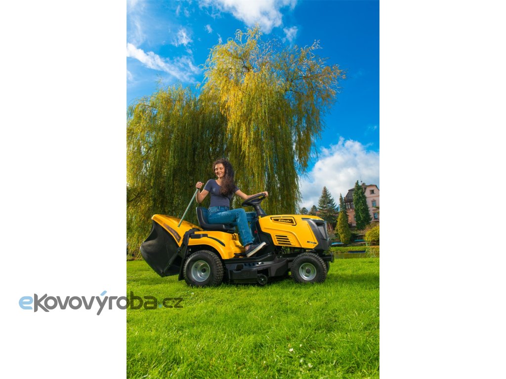 Žací ústrojí o šířce 92 cm zajišťuje rychlé posečení velkých ploch a zároveň dovoluje sekat těsně u zídek nebo chodníků. Plovoucí konstrukce s antiskalpovacími kolečky chrání trávník na nerovném terénu. Díky hladkým řemenům žací nože při nárazu na překážku lehce proklouznou, čímž minimalizují riziko poškození uložení hřídele.
