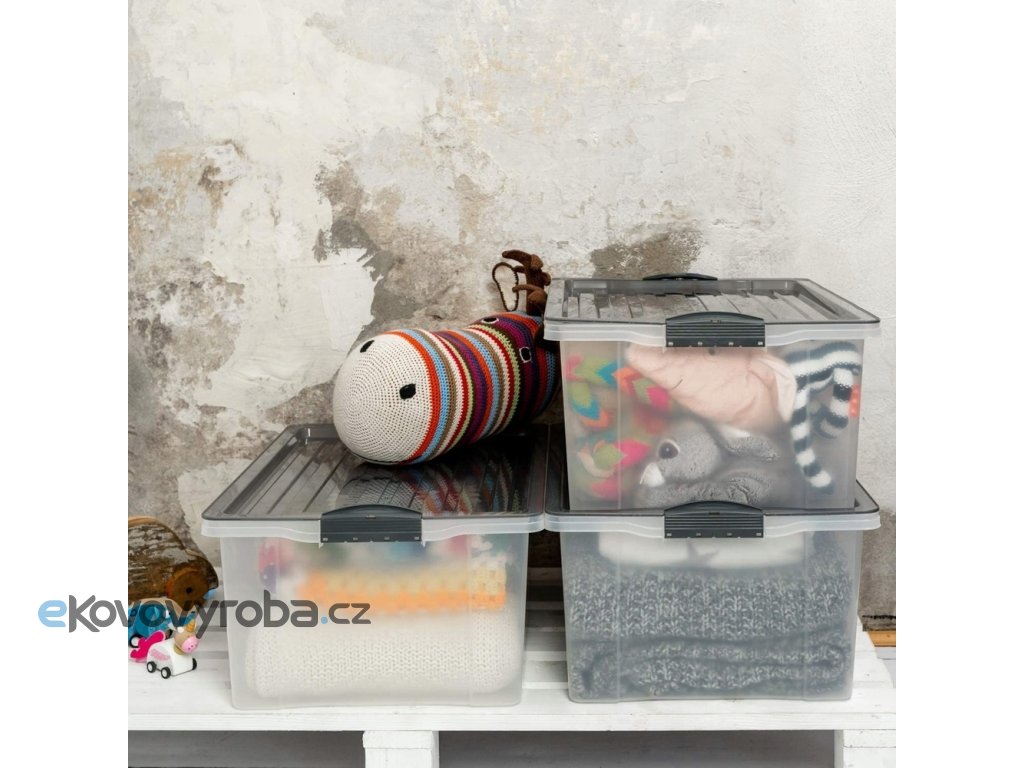 Úložný box o objemu 70L. Transparentní box + šedé víko. Víko je opatřeno klipy proti nežádoucímu otevření. Kvalitní materiál a provedení.