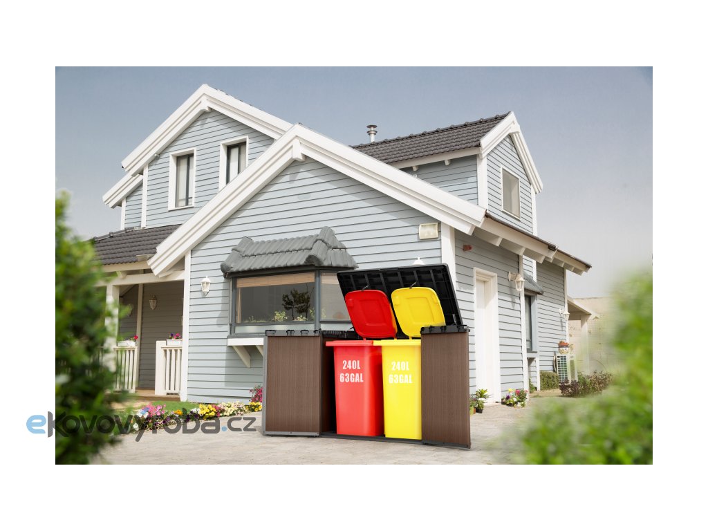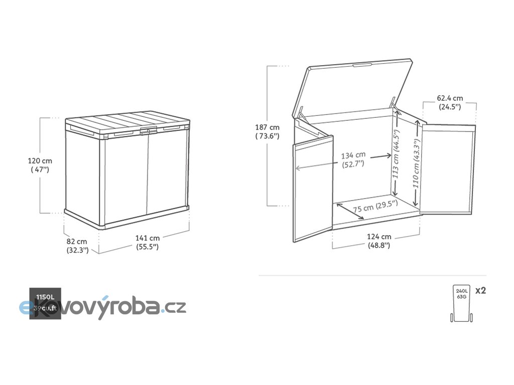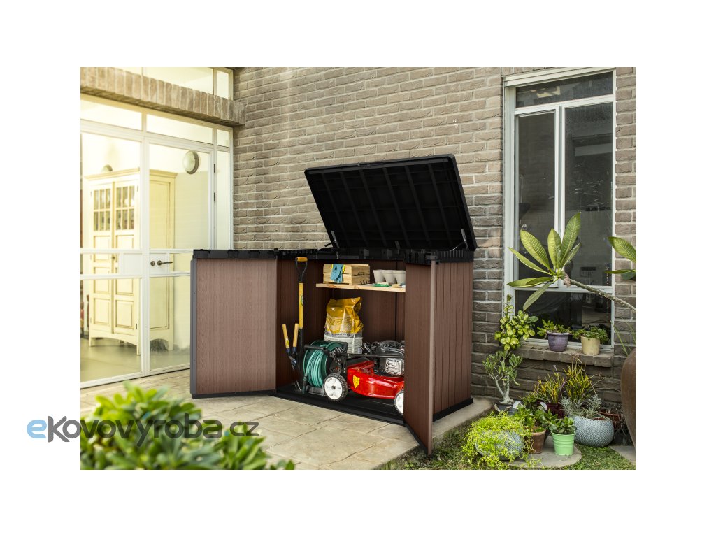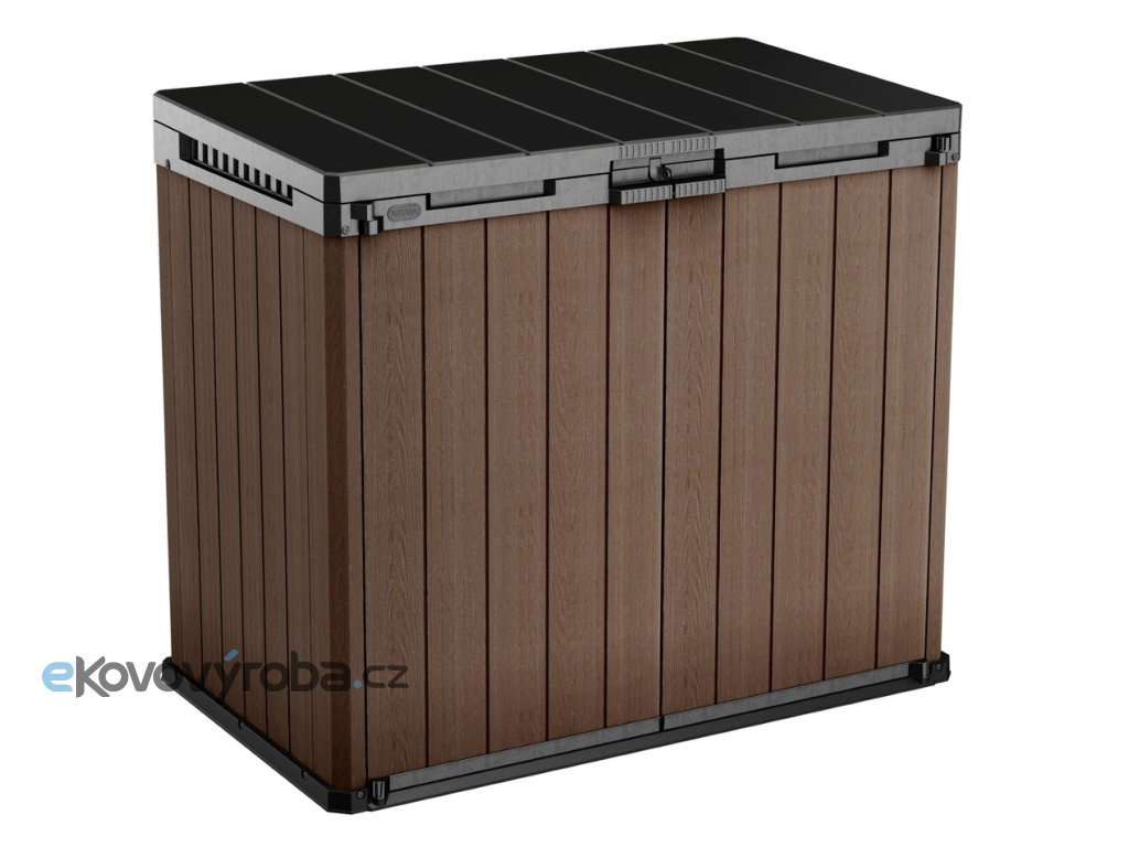 Designová, plastová skříň z řady DARWIN v hnědém provedení disponuje úložným prostorem o objemu 1 150 L. Skříňka DARWIN umožňuje pohodlně uložit vše, co chcete mít po ruce na Vaší zahradě. Ideální pro uschování zahradního nářadí, zahradních doplňků nebo sportovního vybavení. Je možné do ní také uschovat popelnice. Ke snadné manipulaci a otevírání víka slouží hydraulické písty, součástí balení jsou i řetízky pro případné uchycení vík popelnic. Snadný přístup poskytují široké dvojité přední dveře. Skříňka se vyznačuje jednoduchým a elegantním designem a také strukturou povrchu připomínající dřevo. Kvalitní kompozitní materiál EVOTECH i na dotek připomíná dřevo, ale je pevnější než samotné dřevo. Vysoce kvalitní plastové materiály zajišťují životnost výrobku po mnoho let. Skříňka je uzamykatelná. Montáž je velmi jednoduchá a nevyžaduje žádné specializované nástroje. Skříňka je odolná vůči nepříznivým povětrnostním podmínkám a je v ní zabudovaná ventilace pro zajištění ideální klima uvnitří skříně. Výborně doplní a rozšíří prostor u Vašeho zahradního domku například u domků a boxů z řady Darwin.