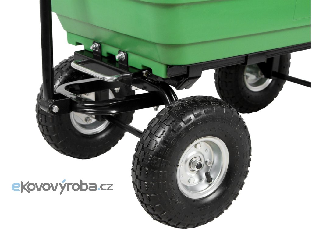 Konstrukce vozíku je složena ze stabilní ocelové konstrukce, plastové vaničky o objemu 75 l a nafukovacích koleček.